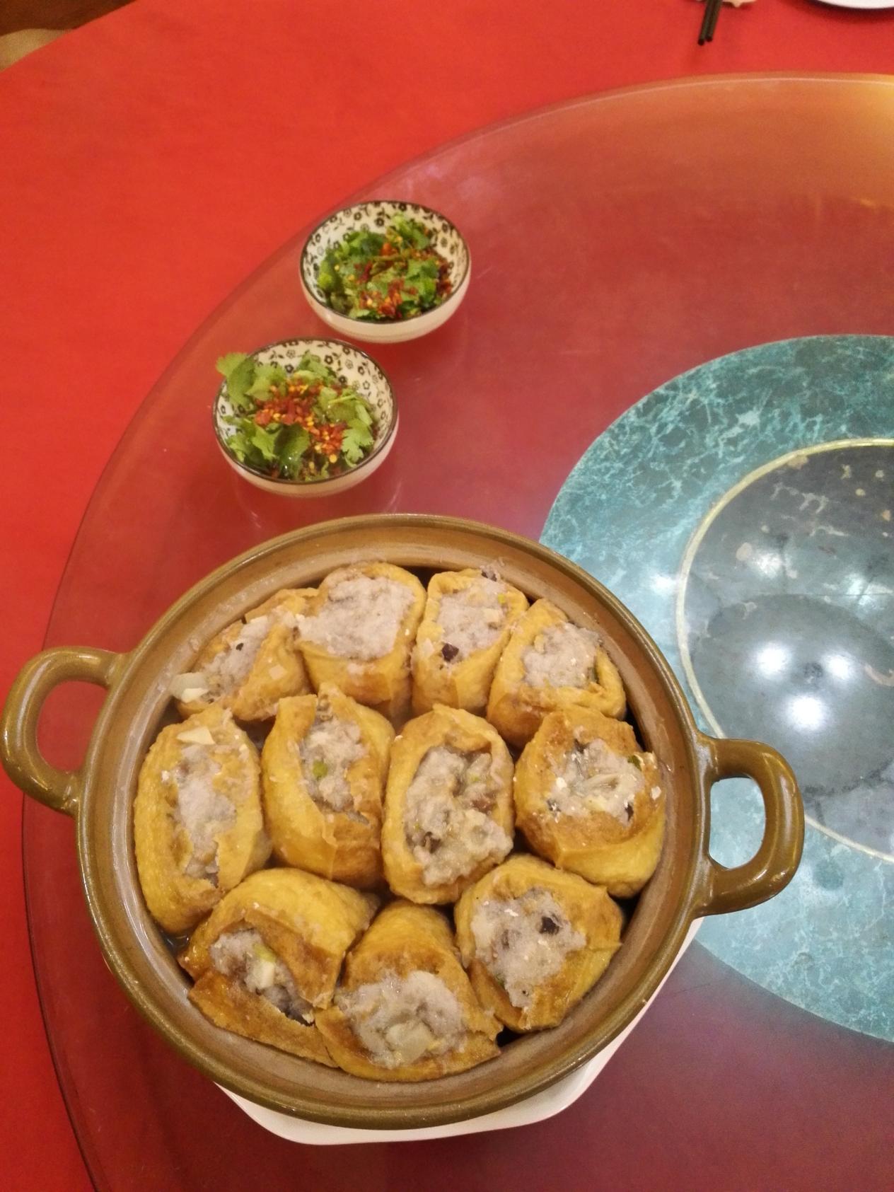 “酿豆腐”是南雄市特有的一种客家美食,随着中原人南迁在该地域已流传有千年之久。南雄酿豆腐馅料丰富多样,需用新鲜的芋头、香脆的小虾米,还有腊肉碎、蘑菇、大地鱼、香葱等剁碎拌匀,有些人家还会按不同喜好加入腊鸭肠、猪肉沫等不同配料。馅料制作完成后,将大块的油豆腐包开个小口,将里面的瓤挖出,再酿入馅料,最后放入蒸锅蒸熟即可食用。2016年,《南雄酿豆腐制作技艺》被列入第六批韶关市非物质文化遗产代表性项目名录。