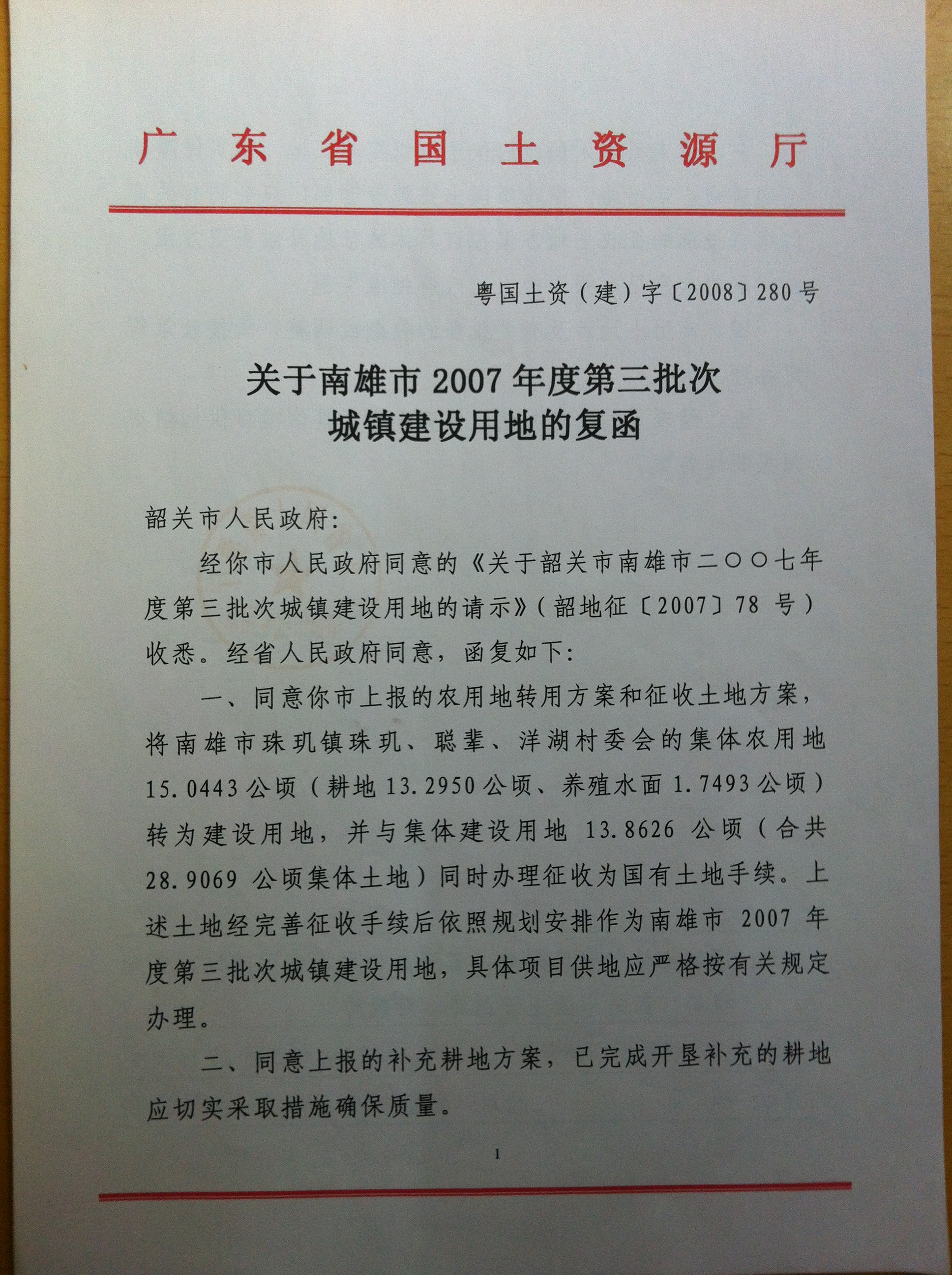 关于南雄市2007年度第三批次城镇建设用地的批复